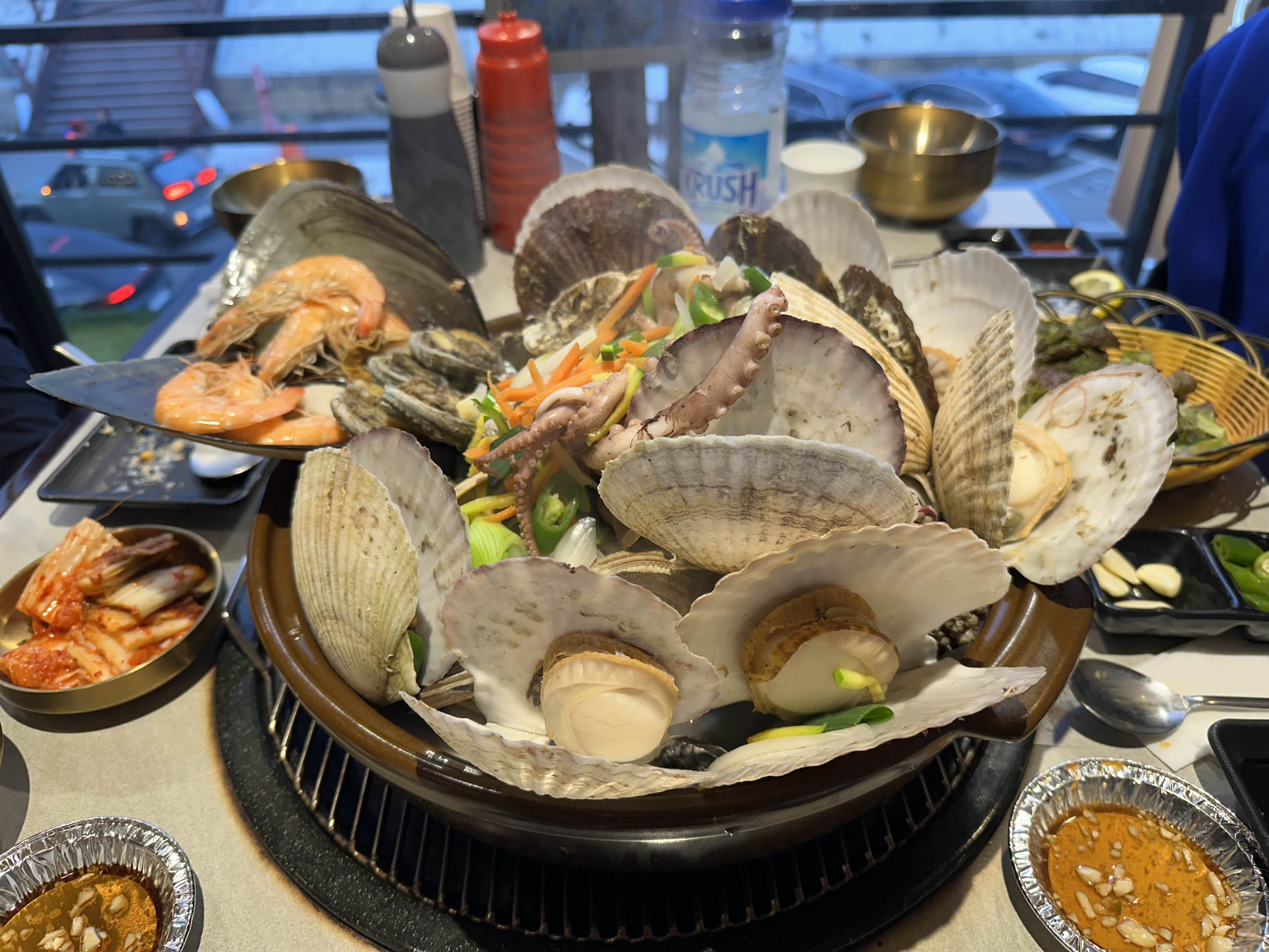 엄청난 크기의 그릇 위로 조개들이 탑처럼 쌓여서 나왔습니다. 키조개, 가리비, 전복, 소라, 백합 등등 종류도 어마어마한데, 빈 껍데기로 채운 게 아니라 속이 꽉 찬 실한 놈들로만 가득했습니다. 사장님, 남는 거 맞죠?